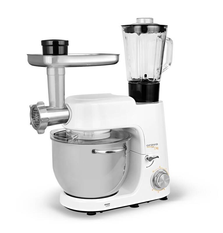 Ovládací páka Pro jednoduché odklopení horní části robotu stačí pouze umístit páčku do spodní polohy a umístit robot do požadované polohy. Tuto možnost oceníte především během nutnosti výměny metly nebo sejmutí nádoby s již hotovým těstem. Posuvné ovládání Dolní číst přístroje je vybavena hlavním knoflíkem ovládání. Pro nastavení jedné z 6 rychlostí stačí pouze pootočit knoflíkem. Pro maximální přehlednost aktuálně nastavené rychlosti je okolní část knoflíku opatřena přehledným popisem jednotlivých rychlostí. Kovový mlýnek Mezi bohaté příslušenství kuchyňského robotu patří také kovový mlýnek na maso se 3 nástavci pro různou tloušťku mletí. Pohodlně si tak můžete připravit maso na nejrůznější pokrmy. Sklenění nádoba Pro mixování omáček, polévek, koktejlů nebo smoothie oceníte skleněnou nádobu mixéru o objemu 1,5 l. Praktické víko je vybaveno otvorem pro doplňování surovin do mixéru během provozu. Nerezová nádoba Vymíchejte nebo vyšlehejte dokonalé těsto i vaše vyhlášené krémy do dortů a koláčů v praktické míse o objemu 7 l. Nerezová mísa se pyšní kvalitním zpracováním a dlouholetou životností. Odklápěcí víko Hnětený obsah nerezové nádoby je chráněn plastovým víkem. Praktické víko s odklopnou částí zajišťuje maximální bezpečnost během provozu a umožňuje přidávání surovin do mísy během hnětení či šlehání. Forma na cukroví Už naše babičky milovaly vytlačované cukroví. Ozdobná nerezová forma nabízí 4 druhy tvaru cukroví, které lze snadno nastavit a upevnit na masomlýnek. 3 struhadla Na struhadle se 3 různými velikostmi můžete krájet a strouhat zeleninu a ovoce do salátů, ale i na sladké a slané koláče. Užívejte si přípravu oblíbených pokrmů s šikovným pomocníkem značky Orava! Domácí lahůdky Snili jste o vlastních uzeninách či lahodných domácích hamburgerech? S mlýnkem snadno rozemele maso na poctivý burger a hravě si na něm připravíte i domácí klobásky nebo jitrnice pro celou rodinu a přátele. Extra nástavce Pokud patříte mezi milovníky italských těstovin, zamilujete si 6 různých disků pro snadnou a rychlou přípravu domácích těstovin. Sestavení disků je jednoduché a rychlé a jejich údržba je nenáročná. Výměnné nástavce na těstoviny nejsou součástí příslušenství robotu Orava Chef.Multifunkční kuchyňský robot 1 400 W.- Moderní a elegantní design