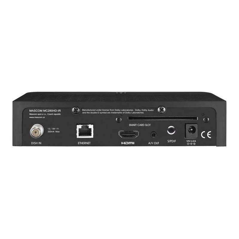 MASCOM MC280HDIR-USBPVR HD digitální satelitní přijímač plně kompatibilní se standardem DVB, umožňuje příjem vysílání ve standartním (SD) i vysokém rozlišení (HD). Přijímač je vybaven vestavěným dekodérem Irdeto (Skylink Ready) a USB digitálním videorekordérem. Vestavěný dekodér Irdeto zaručuje bezpečný příjem programů kódovaných v systému Irdeto. Funkce FastScan zaručuje automatickou aktualizaci programů Skylink bez ručního přelaďování. V paměti lze uložit až 4000 programů satelitního vysílání. Seznam programů podporuje vytváření seznamů oblíbených programů a jejich editaci. Přijímač podporuje instalaci nových verzí software přímo z vysílání (OTA upgrade). VLASTNOSTI A FUNKCE - Certifikát Skylink Ready pro Irdeto karty Skylink