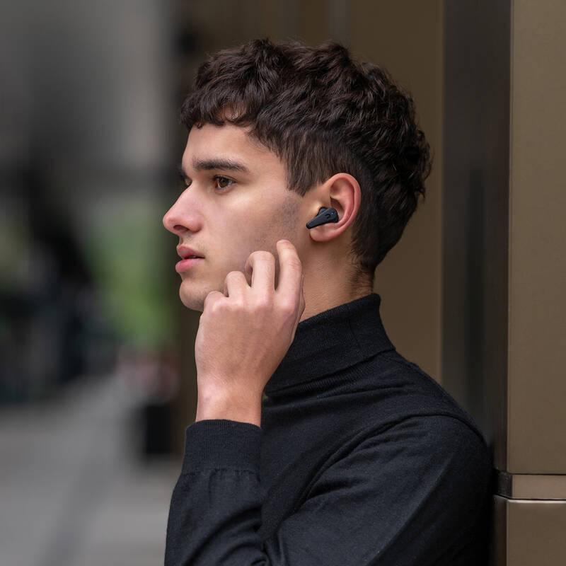 Okolní zvuky? Jen na přání! Díky technologii ANC, tedy aktivnímu potlačení ruchů, uslyšíte jen hudbu a nic víc. Žádný hluk ani hovory v okolí nebudou rušit váš poslech. Pokud ale například rádi běháte s hudbou v uších, a zároveň chcete běhat bezpečně, stačí aktivovat ambient mód. Pak uslyšíte i zvuky dopravy nebo hlasy z okolí, takže vás nic během tréninku nemůže překvapit. Malá sluchátka, velká výdrž Sluchátka vydrží hrát celých 6 hodin. Pokud si s sebou na cesty ovšem vezmete ještě předem nabité pouzdro, budete mít hned celkem 24 hodin poslechu v kapse, protože pouzdro poslouží jako nabíječka. Dokonalý zvuk především Sluchátka mají vyladěný zvuk – basy jsou hluboké, středy jasné a výšky ostré. Díky dostatečně velkým měničům (8mm) je zvuk výrazný a za kvalitním přenosem hudby stojí mimo jiné i kodek AAC. Spolu s již zmíněným ANC se tak můžete s těmito sluchátky zcela ponořit do hudby, kterou máte rádi. Nabíjejte bezdrátově nebo přes USB-C Bezdrátová sluchátka vám dají svobodu pohybu, jejich pouzdro zas přináší moderní a pohodlné nabíjení, a to i díky USB-C konektoru, u kterého při zapojování nemusíte řešit, kde je dole a kde nahoře. A nabíjení jde i bez kabelů, energii totiž rychle doplníte i přes bezdrátové nabíjení. Pro malé i velké uši Nespadají vaše boltce do kategorie „standard“? S těmito sluchátky nebude poslech hudby problém – v balení totiž máte 3 velikosti špuntů, takže si najdete tu správnou, ať už máte uši jakékoliv. Dotykové ovládání sluchátek je pak jednoduché a intuitivní. A co když poběžíte v dešti? Nevadí, sluchátka mají stupeň krytí IPX5, takže je jen tak něco neohrozí. Technické specifikace: - Bluetooth:5.0